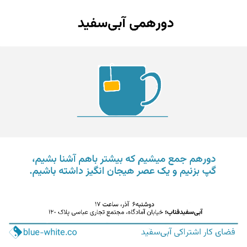 برنامهها، کارگاهها، رویدادها و اتفاقات مهمی درشعب فضای کار اشتراکی آبیسفید میافتد که ما را دور هم جمع میکند، تا آشنا شویم و یاد بگیریم.